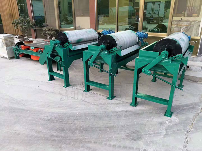 CTS、CTN、CTB系列永磁筒式磁選機磁場分旋轉式、固定式兩種機構,固定式主要適用于弱磁場濕式選別細顆粒的強磁性物質,或者除去非磁性礦物中的強磁性礦物,當漿流入磁場區時,其中強磁性礦物被吸附在圓筒表面,弱磁性和非磁性礦物被分選后排除,而吸附在圓筒表面的強磁性礦物隨圓筒的旋轉被帶出磁場區。旋轉式適用于細粒強(中強)磁性礦物的干選,由于高速旋轉的作用,使磁性顆粒的磁滾翻次數大大高于普通磁選機,這對于破環磁團聚,提高富礦比具有顯著的效果,礦物經分選后被分離成磁性物和非磁性物兩種,分別從各自的排礦口排出該機,適用于礦石粒度為0.6-6mm的粗選和精選。 同一圓筒可配三種槽體,即順流槽(CTS)選別粒度≤6mm,逆流糟(CTN)選別粒度≤0.6mm,半逆流槽(CTB)選別粒度≤1mm。