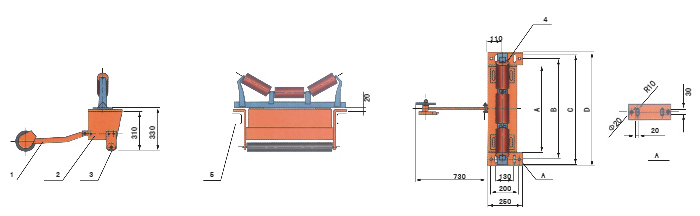 說明:1、測速車及測速傳感器 2、稱重架 3、輔助輥 4、原輸送機托輥改制的計量托輥 5、輸送機框架