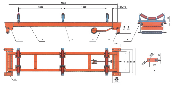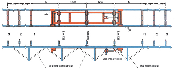 說明:1、稱重架 2、稱重橋 3、原輸送機托輥改制的計量托輥 4、測速車及測速傳感器 5、輔助輥 6、輸送機框架