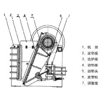 該系列破碎機工作方式為曲動擠壓型,其工作原理是:電動機驅動皮帶和皮帶輪,通過偏心軸使動顎上下運動,當動顎上升時肘板與動顎間夾角變大,從而推動動顎板向固定顎板接近,與其同時物料被壓碎或劈碎,達到破碎的目的;當動顎下行時,肘板與動顎夾角變小,動顎板在拉桿,彈簧的作用下,離開固定顎板,此時已破碎物料從破碎腔下口排出。隨著電動機連續轉動而破碎機動顎做周期運動壓碎和排泄物料,實現批量生產。